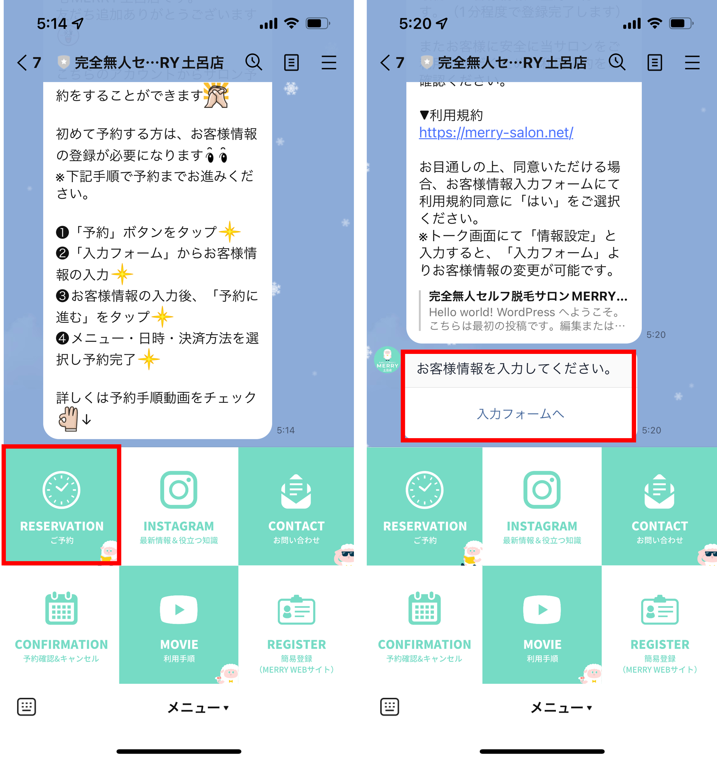 友だち追加した店舗公式LINEアカウントの下部メニュー「ご予約」ボタンをタップし、詳細なお客様情報の入力をします。