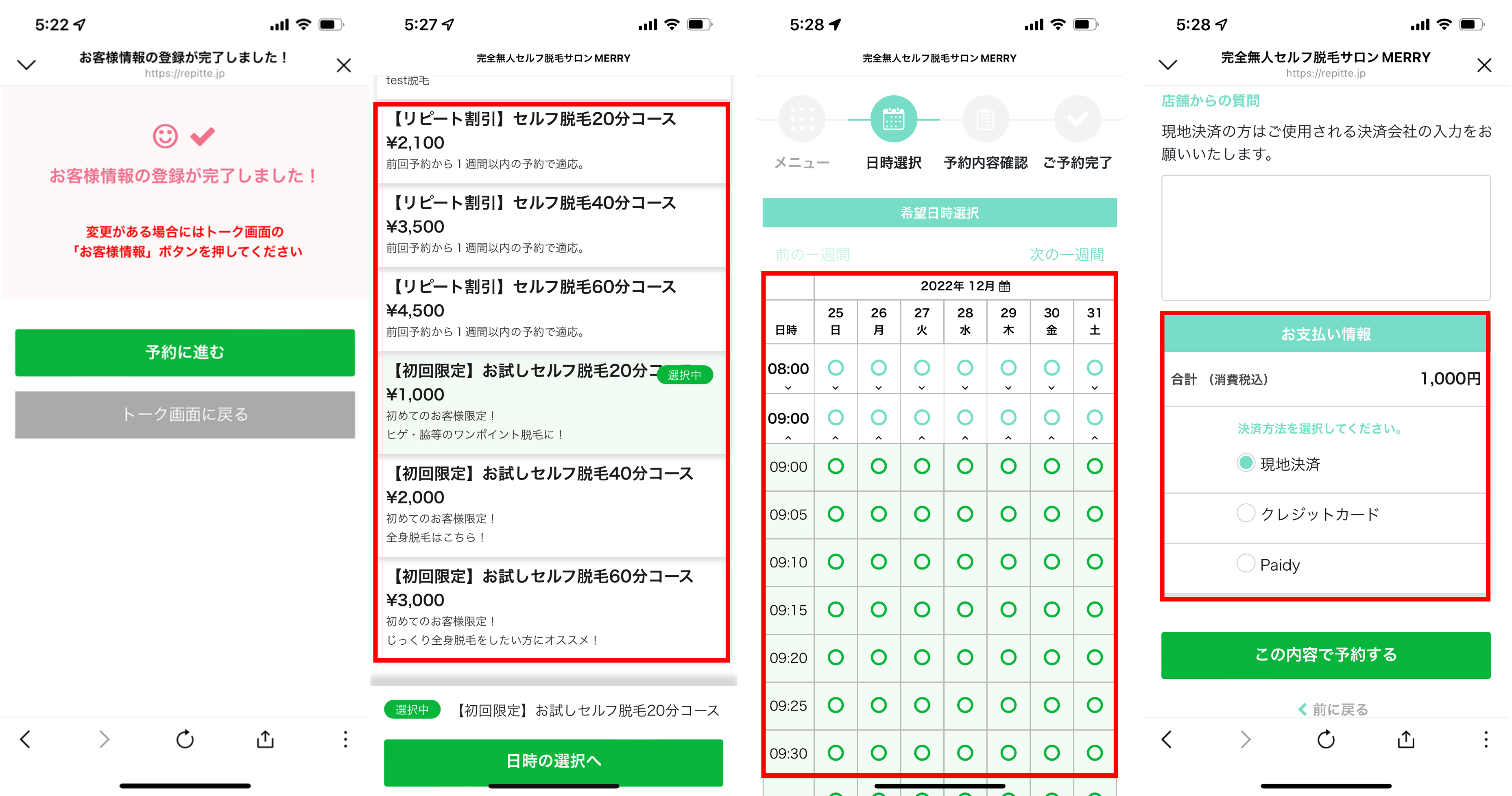 登録後、画面上の「予約に進む」をタップし、施術メニューを選択します。ご希望の予約日時を選択し、決済方法の選択へ進みます。