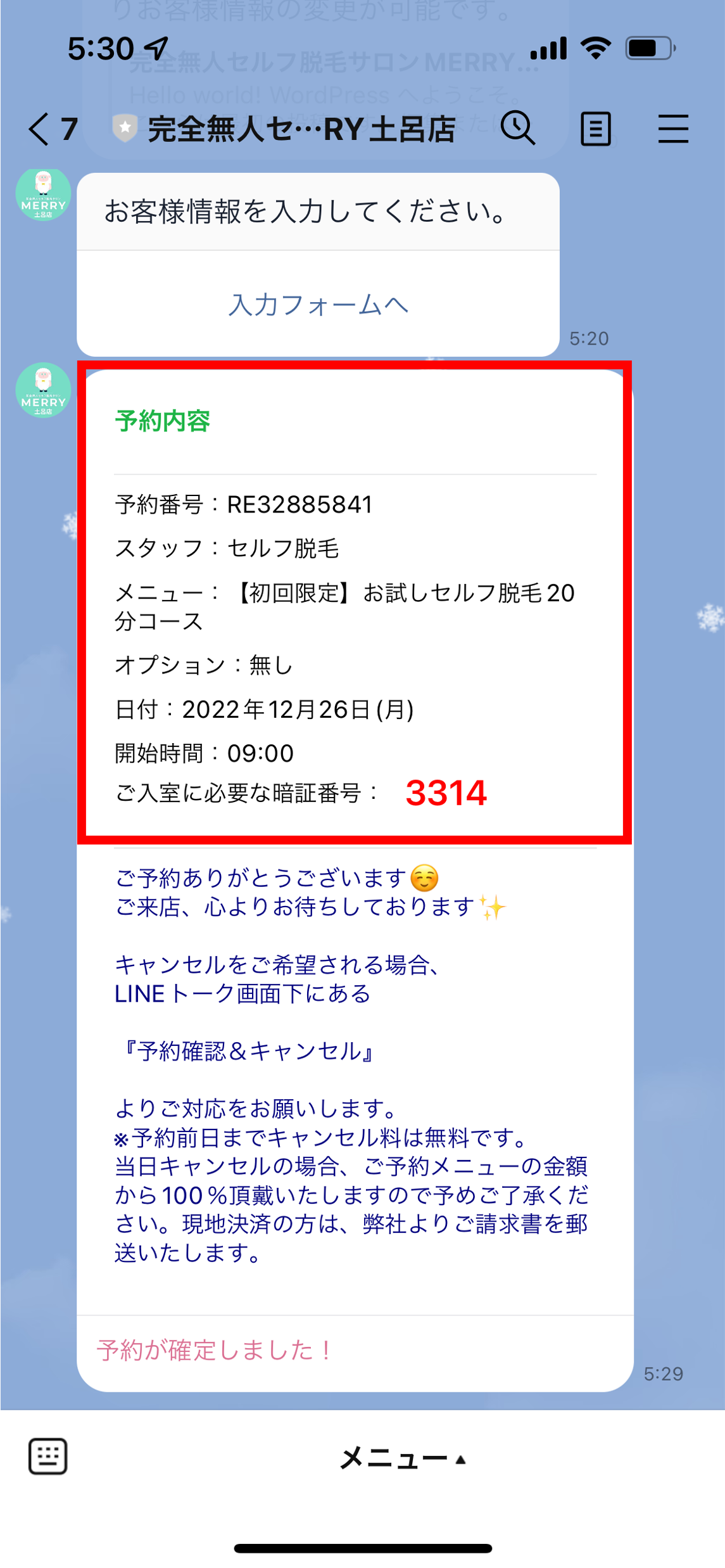 決済方法の選定・確定後、LINEトーク画面に「当日の予約時間・入室パスコード」が届きます。